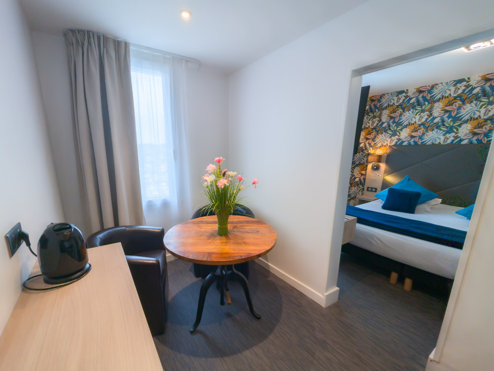 Ces chambres récemment rénovées offrent une atmosphère moderne et lumineuse, avec une vue sur les toits de la ville. Les finitions soignées et les matériaux contemporains créent un espace à la fois élégant et confortable. Un cadre idéal pour se détendre après une journée bien remplie, avec la sensation d’être à l’abri du tumulte urbain, tout en profitant d’un décor moderne et raffiné